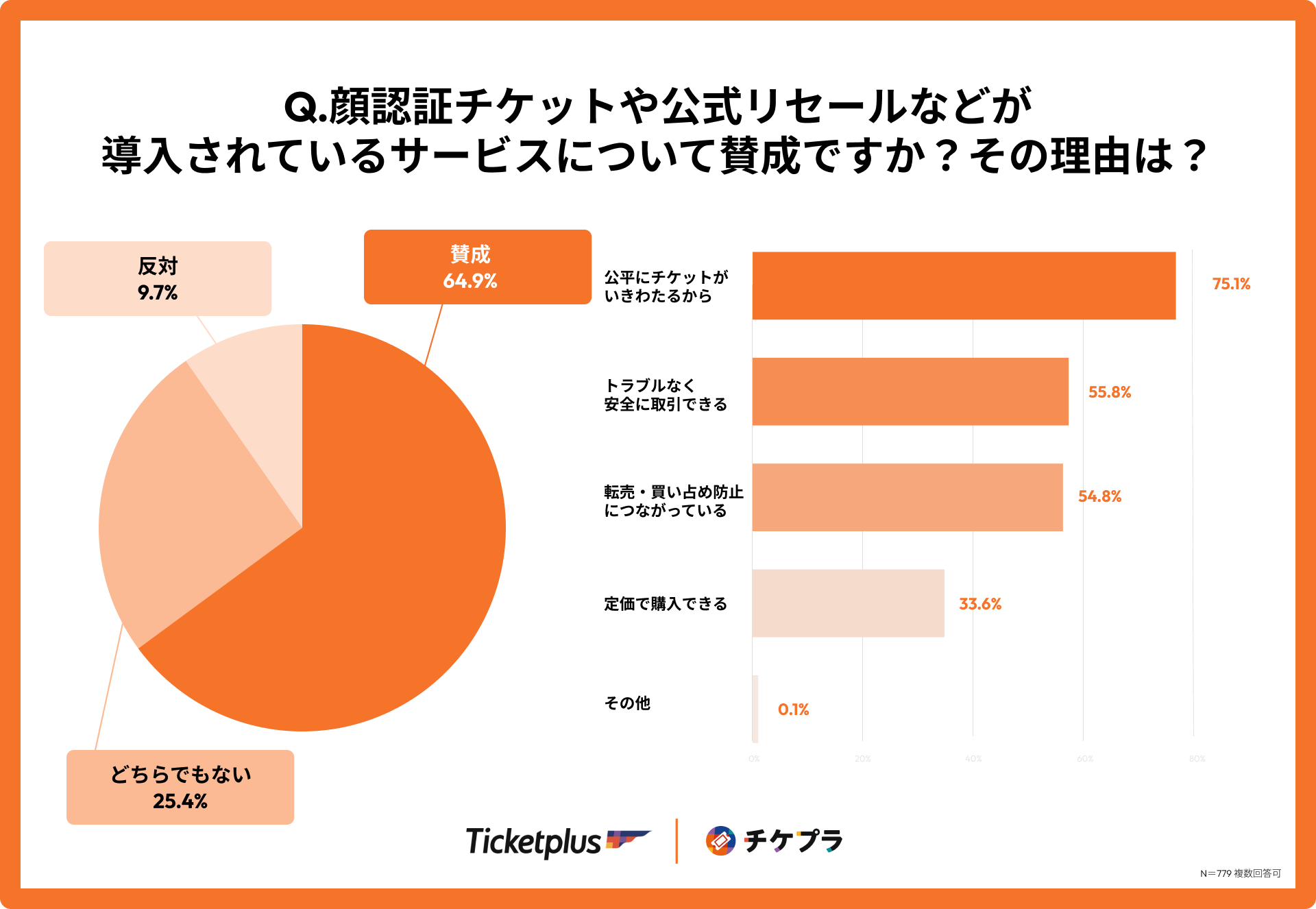 ④73%が転売行為を容認できないと回答。また、64.9%が顔認証・公式リセールなどの転売防止システムに賛同していることが判明し、多くの人が“安心感”、“安全性”、“公平性”をチケット取引に求めていると判明。