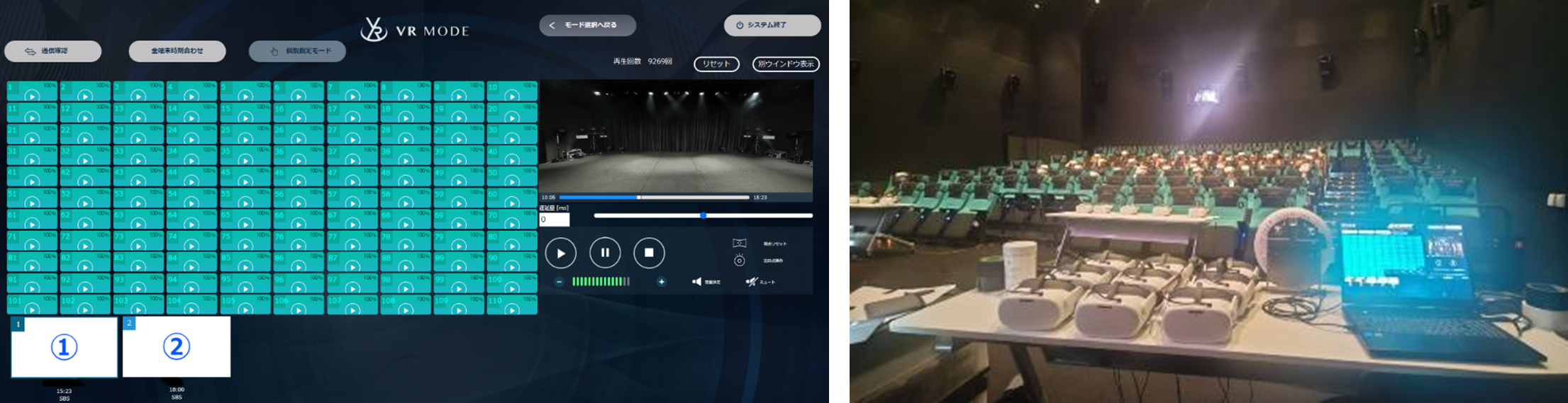 通常、VR映像を体験いただく場合は、個々のヘッドマウントディスプレイ(HMD)を操作する必要がありますが、本システムを使用すれば、PCの再生ボタンを押すだけで、HMDを一斉に再生させる事が可能です。